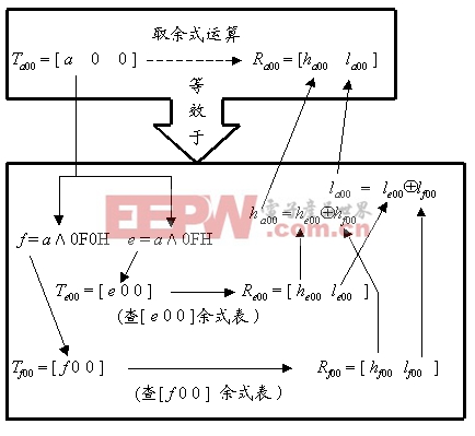 式表。由于Te00和Tf00中只有半个字节不为零,所以,每个余式表只需16个单元(32个字节),两个余式表总共只占用64个字节,这样就可满足PIC单片机的要求了。 由上述思路可知,e=a∧0F0H ,f=a∧0FH ,因此可得,Ta00=Te00? Tf00,同时,还可以证明它们余式的关系为Ra00=Re00? Rf00,也就是说,如果设Ra00=[ ha00 la00 ]、Re00=[ he00 le00 ]和Rf00=[ hf00 lf00 ],则ha00=he00? hf00 ,la00=le00? lf00。这样,三字节序列[a 0 0 ] 的计算可由图3所示的方法来进行,其中,[e 0 0 ]和[f 0 0 ]余式表见表2和表3。