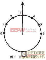 如图1所示。由于自主吸尘机器人主要的避障行为是前进、停顿、转弯,因此采用7组传感器均布在机器人的正前方,覆盖180°的半圆范围,以充分探测障碍物。其中,第1、2、3、4组传感器由一对超声波传感器和一对红外传感器组成,其他几组由一对红外传感器组成。每组传感器共同提供某一时刻特定方位的障碍物信息。由于右侧需布置机器人自主回归电路,故减少一对超声波传感器。