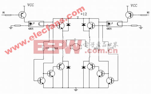 在实验中的控制系统电压统一为5v电源,因此若达林顿管基极由控制系统直接控制,则控制电压最高为5V,再加上三极管本身压降,加到电动机两端的电压就只有4V左右,严重减弱了电动机的驱动力。基于上述考虑,我们运用了4N25光耦集成块,将控制部分与电动机的驱动部分隔离开来。输入端各通过一个三极管增大光耦的驱动电流;电动机驱动部分通过外接12V电源驱动。这样不仅增加了各系统模块之间的隔离度,也使驱动电流得到了大大的增强。