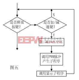 调速档、持续加/减速:调速档通过(0-6)共七档固定占空比,即相应档位相应改变hlt,llt的值,以实现调速档位的实现。而要实现按住加/减速键不放时恒加或恒减速直到放开停止,就需在判断是否松开该按键时,每进行一次增加/减少1%占空比(即hlt++/--;llt--/++),其程序流程图如图五。