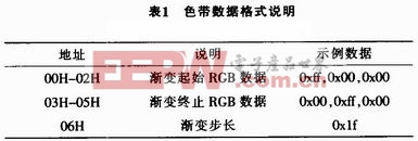 由于单片机内部程序空间有限,数据处理能力有限,所以需要用简洁的数据模型表示LED变换效果。因此本文设计了一种色带数据格式和特效数据格式。具体内容如表1所示。