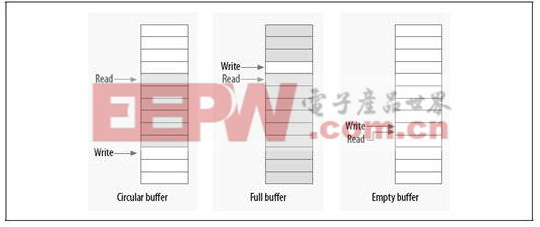 如图所示,当读者和写者指针相等时,表明缓冲区是空的,而只要写入指针在读取指针后面时,表明缓冲区已满。