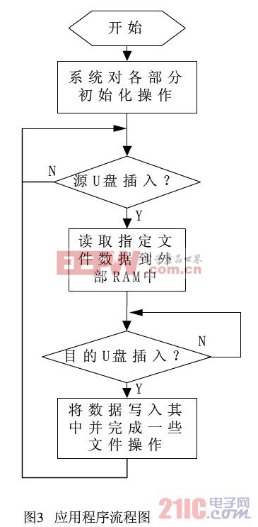 功能(例如采集数据等等),之后查询是否有U盘插入,插入之后即可根据具体需要完成相应的文件操作。本设计的应用系统的程序流程图如图2所示。