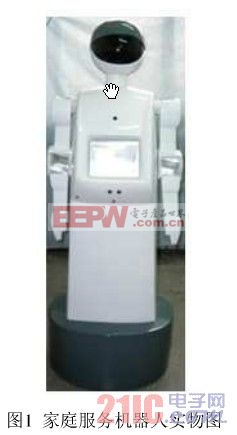 本文介绍的家庭服务机器人如图1所示。机器人身高140cm,行走驱动方式采取轮式差动驱动。胳膊是模拟肩关节、肘关节的三自由度结构,采用伺服电机作为关节执行机构。机器人上面安装了摄像头、麦克风接口、触摸液晶屏、超声波