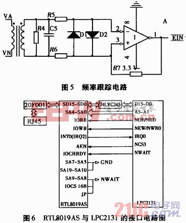 频率跟踪电路的主要作用是保持与电网电压的同步关系,避免频谱泄露现象。相电压经过变压器降压,通过两个二极管D1、D2,再送入放大器,将正弦信号转换为方波信号。电阻R7起到的作用是产生一个正反馈,加速放大器的跳变过程,得到更加精确的同步信号。图5即为频率跟踪电路。