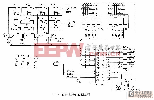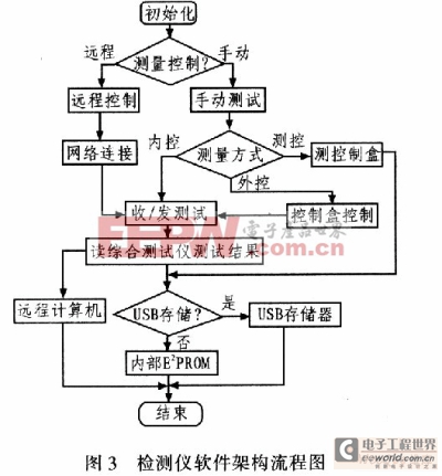 的可靠性,检测仪显示电路采用抗干扰性强的LED数码管显示,LED数码管的驱动器选用ZLG7290,ZLG7290利用三线串行码与ARM处理器进行信息交互,其动态显示功能降低了系统功耗。ZLG7290除了用来驱动显示数码管外,电台检测的部分输入也通过其键盘接口来实现,其电路图如图2所示。 1.7 其他电路 一个系统能可靠工作,必须有一系列诸如晶体振荡、看门狗、电源等电路保证,提供系统工作所必需的时钟、监视电路,晶体振荡电路提供必须的时钟信号,看门狗电路在程序运行出现异常时,把微控制器提供复位信号,增加了系统的鲁棒性:电源电路为整个系统电源,采用转换效率高的DC/DC开关电源,按功能为系统设计供电,即为控制电路电源和调理电路独立供电:增加了系统的抗干扰性。 1.8 调理电路 检测控制器的工作状态和工作时序由主控制器来完成,然而这只是检测控制器检能正常工作的一个方面,另外一个重要方面就是调理电路,其主要由继电器阵列、分压网络、模拟开关、电平转换等部分组成。控制器输出的信号一般不能直接加到电台内部,这主要有两方面原因:1)检测控制器输出的串口数据为单端输出,而该电台所需要的信号为差分信号;2)控制器输出的信号电平和格式完全正确,为保证系统 的抗干扰性,在控制器的输出端和电台输入端一般要加一个缓冲器,增加系统模块之间的隔离度。检测控制器面板的所有控制信息经过处理器处理后通过串口发送给电台,而电台所需要的为差分信号,利用DSl6F95来实现信号电平方式的转换。检测控制器除了测试收发机性能外还可以测试控制盒的性能,另外也可以利用控制来控制收发机,从而模拟机上控制盒控制收发机,在控制盒控制和检测控制器本身信号不能同时发送到电台,这就需要继电器阵列来完成检测仪和控制盒之间的转换。另外,为监控电台工作电压,检测仪要分时显示出工作电压,而工作电台27V以及内部收发控制电压等也要显示,这些电压需要分压网络经过分压后送到数控模拟开关,控制器轮流监视各路电压。 2 软件架构设计 电台检测控制器属于典型的嵌入式控制系统,其性能设计的好坏直接关系到系统是否能够可靠工作。嵌入式软件设计和普通的PC机软件差别较大,由于检测仪控制关系复杂,再加上网络接口、USB存储驱动、中断时间控制、定时器设计、串行通信等因素,对软件架构的要求较高,必须考虑软件和硬件检测协调,另外软件还必须满足可测性、可移植性、健壮性等设计,要综合考虑多种因素。该电台检测控制器的软件流程如图3所示。系统上电后经过初始化配置,然后选择测量控制方式,若是远程控制则启动网络连接,用计算机来控制检测控制器进行工作,进入收发机性能测试,测试的结果通过网络存储到远程计算机中;若是手动测试,则判断测量方式是测控、外控还是测控,如果是内控,则由检测控制器控制收发机,在无线电综合测试仪的配合下测量收发机主要性能,通过读取无线电综合测试仪的测试结果可以把结果保存下来,在保存结果时,如果USB存储设备存在,则把结果存在其中,反之,则存于内部的可擦写的E2PROM中;若是测控,则检测控制器测量控制盒状态,并把结果保存起来;如果是外控,则在控制盒的控制下测量收发机性能,检测控制器通过读无线电综合测试仪结果同样把测试结果保存下来。 3 结束语 基于ARM实现的电台检测控制器硬件设计灵活,软件架构设计良好,实现了软件与硬件平台的无缝结合,具有高性能、低功耗、可移植性好、可扩展性好,实现了对电台的检测与控制。通过网络接口,可以实现远程控制,并可以实时读取测量结果:通过增加USB存储接口,在手动测试的情况下还可以把测量数据直接保存下来,极大地提高了测试结果的处理速度,具有广阔的经济效益和军事效益。