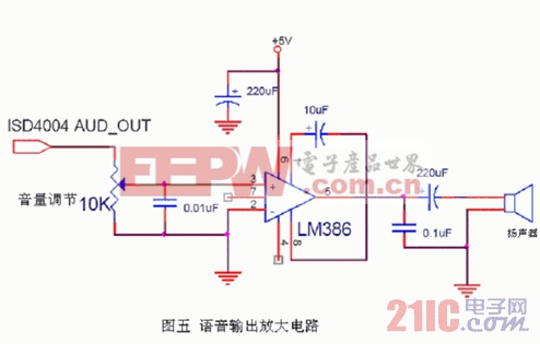 放大电路部分: 语音放大电路(本系统采用差分驱动放大器)是对语音输入信号进行放大处理,以达到ISD4004输入信号的要求,使用功率放大器(图五)来驱动扬声器,通过放大滤波可以使扬声器发出清晰而且响亮的语音信号。
