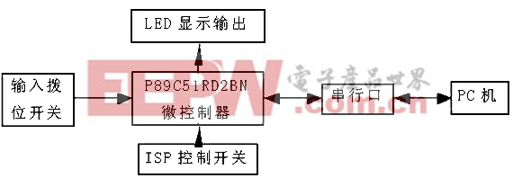 本实验方法的硬件部分主要由PC机以及微控制器电路和多个LED电路组成。微控制器选用Philips公司生产的P89C51RD2BN。该芯片内部集成了多种功能部件,如四个8位的数字I/O口,8路A/D转换接口、UART、定时器、看门狗定时器和FLASH存储器等。微控制器的主要功能是:用户输入输出端口状态扫描输入,用户输入输出端口信号输入和数字信号显示等。实验硬件组成框图如图1所示。