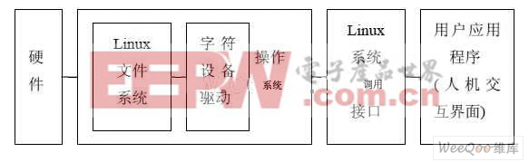 系统的设计分为字符设备驱动程序和人机交互界面两部分。驱动程序为应用程序提供了操作设备的接口;人机交互界面的设计实现设备应用程序并完成人机交互的功能。整个系统软硬件的关系如图 1:字符设备被映射到 Linux文件系统的文件和目录,通过文件系统的系统调用接口 open(),write(),read(),close()等函数访问字符设备,实现设备的操作。