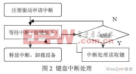在 Linux 系统中,中断是由系统来管理与维护的。中断服务子程序在初始化函数中调用 request_irq 函数与相应中断号关联,并将该中断的相关信息添加到系统的中断信息列表中。中断发生时, Linux系统响应中断号来实现中断处理程序的执行。mini键盘按键触发产生中断号为 SIMPLE_KEY_IRQ的中断,系统自动检索并调用键盘中断服务子程序。键盘中断处理流程如图 2: