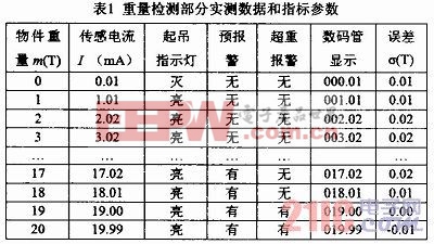 实验结果说明:1)数码管显示值与物件重量实际值偏差较小;2)重量检测精度高,分辨率可达到0.01T;3)预报警和超重报警功能正常;4)能实现系统自我保护。为了减小误差,实际应用中将多次实验的数据制成表格,并进行修正。