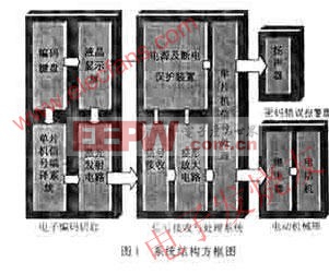 下面就其主要系统的运行原理及其关键技术进行具体的介绍。由编码及发射部分、接收信息 及处理部分、机械锁三大部分组成。其具体结构如图1所示。