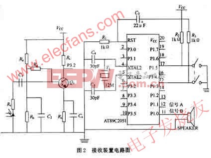 这一部分主要是对激光信号的检测,以及对其进行的处理。首先,硬件选用了UDU2C型号的 光敏二极管作为检测激光信号的主要元件,但是为了提高其检测精度以及检测距离,在此二 极管前加一个光学凹镜,从而使从很远处射过来的发散光线能够重新聚焦,确保了其远距离 接 收与检测。最后再将检测到的信号进行再次的整形与放大,使信号满足要求。此处用一块A T89C2051芯片,然后通过编程让单片机实现其具体的运算处理。当密码器接收到已经过整形 与放大的信号,就开始判断,如果此信号是设置密码信号,那么便将这个信号放入存储器中 作为记忆内容存储;如果是开锁信号就将收到的信号与以前存在存储器中的密码进行比较。 当所收到的信号与预先存在存储器中的密码相同则输出信号A来启动机械锁装置的继电器, 然后启动小型电动机,从而带动锁闩而将锁打开。当比较的信号不相同的话,则输出信号B 来启动报警电路从而发出警报。考虑到此密码锁有可能在使用的过程中出现断电现象,所以 在这里加了一个电源及断电保护装置,当断电后自动将其电源接到蓄电池上以保证其正常使 用,当电量不足时自动发出电量不足警告,以提醒使用者充电。其基本电路图如图2所示( 断电保护装置只需将图2稍加改动便可使用)。