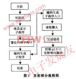 本系统软件采用Keil C语言编写,为了确保控制器的功能完全,结构、原理简单, 采用了自 顶向下、逐步细化的方法。其主程序由两大部分组成,包括发射和接收两大部分。具体流程 分别由图3发射部分流程图和图4接收部分流程图来表示。