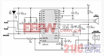 ADμC812 使REC变高(不管芯片处在节电状态还是正在放音),芯片即开始录音。录音期间,REC一直保持为高。REC变低或内存录满后,录音周期结束,芯片自动写入一个信息结束标志(EOM),使以后的重放操作可以及时停止。然后芯片自动进入节电状态。REC的上升沿有84毫秒防颤,防止按键误触发。芯片开始放音。放音持续到EOM标志或内存结束,之后芯片自动进入节电状态。开始放音后,可以释放PLAYE。使电平触发放音(PLAYL) 端从低变高时,芯片开始放音。放音持续至此端回到低电平,或遇到EOM标志,或内存结束。放音结束后芯片自动进入节电状态。使循环放音(PLAYE)端出现高电平时,即开始循环放音,只能断电才能停止。