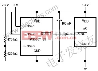从图中可以看出,电压监控有内置晶振,核心部分非常稳定,并且具有温度补偿参考电压体系。第一、第二监控电压被内部电阻反压后与比较器的参考电压进行比较。SENSE 3管脚的输入电压直接与1.25V参考电压进行比较。基于TPS3307的一种典型的电压监控应用可以用图3的模块图表示。该电路可以同时监控2.5V、3.3V和5V三种电压。