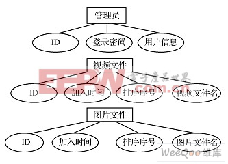 根据广告机监控终端所监控媒体种类的不同,使用Sqlite3 数据库维护媒体视频播放、图片背景和Qt字幕的信息。数据库原理见参考文献[3]。对于广告机监控管理员以及管理者的身份,需要设计管理者的ID、登录密码和对应的用户名信息,以便对广告机的监控和管理。就视频和图片媒体而言,都涉及对相应媒体对象的插入、删除、更新和播放顺序等控制操作,因此分别设置ID、文件名、加入时间和排序序号来进行相应的维护和控制管理。对应的数据库设计原理图如图3所示。