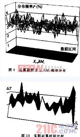 如图9所示;以实际的一组分布来验证重叠算法运算时间的缩短情况,如图10所示(S1为重叠扫描算法,S2为标准算法;图中前面为S1,后面阴影为S2)。可以看到重叠扫描法对浮点多字节乘法运算有很大的改进,它打破了移位加法的传统乘法算法,有了算法的预测功能,提高了乘法运算的速度。本算法在某军工项目中得到应用,效果很好。