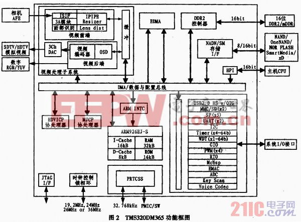 TI公司的TMS320DM365是一款面向多媒体技术应用的高性能芯片。TM320DM365功能框图如图2所示。