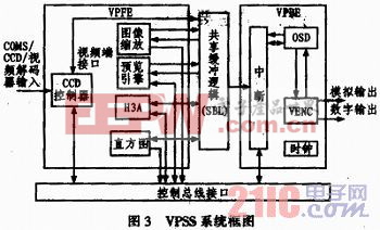 TMS320DM365中的视频处理子系统(VPSS)由两个接口,分别用于视频捕获的视频前段(VPFE)输入接口和用于图像显示的视频后端(VPBE)输出接口。图3为视频处理子系统系统框图。