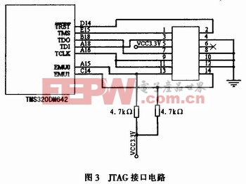 JTAG接口是调试环境和目标板之间的接口,它的好处是可以让开发者在对目标板进行开发的同时可以不改变目标板的系统结构,从而方便了系统的开发与测试。XDS510仿真器通过JTAG接口将系统板与电脑连接起来,这样就可以使用TI提供的集成化开发环境对系统进行调试了。JTAG接口采用标准的双排14脚插座。系统的JTAG接口电路如图3所示。