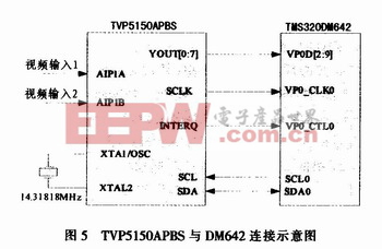 视频输入模块设计采用的视频解码芯片是TVP5150APBS,它是TI公司专门开发的一款可以方便携带的低功耗视频解码芯片,可以广泛用于视频系统的设计。TVP5150APBS的视频输入端可以输入两路复合视频信号或者一路S端子信号。输入信号(如PAL、NTSC等制式)通过增益控制单元、模数转换器和Y/C分离及处理模块后,最后可以转化为8位ITU-R BT.656的数据格式,或者转化为8位4:2:2的数据格式。TVP5150A-PBS的初始化操作是通过操作IIC总线来实现的。TVP5150APBS的IIC地址可以通过控制12CSEL引脚的高低电平来设置。当该引脚是低电平时,IIC地址是0xB8h,当该引脚是高电平时,IIC地址则为0xBAh.TVP5150APBS与TMS320DM642的连接示意如图5所示。