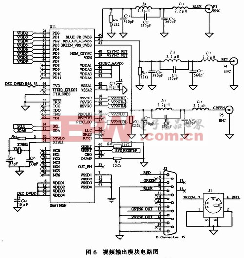 在系统设计中,视频输出模块中的视频编码芯片选用的是Philips公司的SAA7105H,它同时具有SDTV(标准清晰度电视)和HDTV(高清晰度电视)信号编码能力,可以广泛用于视频输出的设计中。视频输出模块的电路如图6所示。