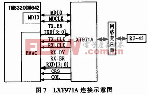 以太网接口设计中的以太网处理芯片采用Intel公司的LXT97lA,它符合IEEE标准,直接支持10 Mbps和100Mbps的双绞线应用,也可以支持100 Mbps的光纤接口。LXT971A与DM642的连接示意图如图7所示,在以太网模块中还需要用到网络变压器和RJ-45以太网连接器。