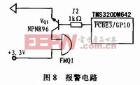 系统的报警电路结构比较简单,它由驱动电路与蜂鸣器构成,驱动电路与DSP的一个GPIO引脚连在一起,电路如图8所示。