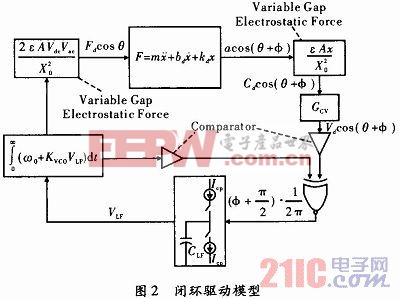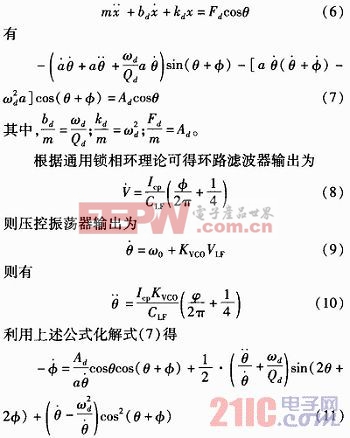 设压控振荡器的输出为Vppcosθ,静电驱动力为Fdcosθ,位移x=acos(θ+φ),则
