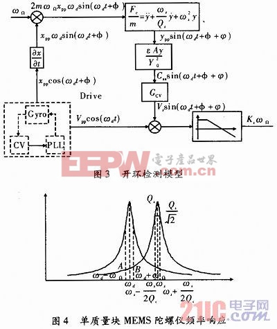 开环检测工作原理如图3所示,当驱动轴稳定工作在其谐振频率后,φ=-π/2,通常ωdω,如果Qs足够大,则φ≈0,通过低通滤波就可以得到跟输入ωΩ相关的电压。对于单质量块的MEMS陀螺仪,其频率响应如图4所示。