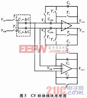 CV转换模块的原理如图5所示,其中虚线部分表示机械部分单轴等效电容。该结构采用辅助运放抵消了等效电容的共模部分,只对等效电容的差模部分敏感,并采用时序控制开关电容电路以得到更高的增益和更低的噪声性能。该电路的输入输出关系为
