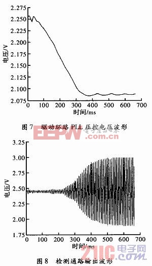 仿真结果如图7和图8所示,图7表明驱动环路能够稳定工作,图8的波形是75°/s(100Hz)输入角速度的输出波形,输出电压峰值为0.5V。
