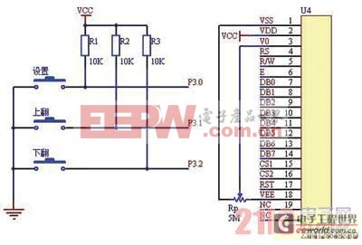 键盘和显示电路如图7所示,由键盘和液晶显示两部分组成。其中键盘采用独立式按键,有3个按键,一个设置键、一个上翻键、一个下翻键。可以进行报警值、工作方式、时钟等各个参数的设置。液晶显示电路采用ZJM12864BSBD这款低功耗的点阵图形式LCD,显示格式为128点(列)×64点(行),具有多功能指令,容易使用,可实时的显示时钟、距离和报警提示信息,方便直观。