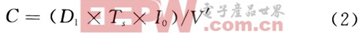 式(2)中:C为电容的值;D1为占空比;TS为MOSFET的开关周期;I0为负载电流;V’为输出电压纹波。