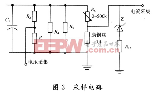 采样电路为电压采集与电流采集电路,采样电路如图3所示。其中P6.O,P6.1为MSP430芯片的采样通道,P6.O为电压采集,P6.1为电流采集。