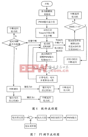MSP430单片机内部具有高、中、低速多个时钟源,可以灵活地配置给各模块使用以及工作于多种低功耗模式,大大降低控制电路的功耗提高整体效率;430F449有ADCl2模块能够实现12位精度的模数转换、硬件乘法器以及带有PWM输出功能的TIMERA和TIMRB定时器,使得整个电路不需要任何扩展就能完成对电源输出电压、电流的实时采集、PI控制、PWM输出;同时MSP430F449带有内部LCD驱动模块,直接将液晶显示屏连接在芯片的驱动端口即可,电路结构极为简单。本设计的软件采用C语言编写,整个程序包括的子模块有:键盘控制模块、A/D电压和电流采集模块、PI控制模块和PWM波发生模块等几个部分,软件流程图如图6所示。