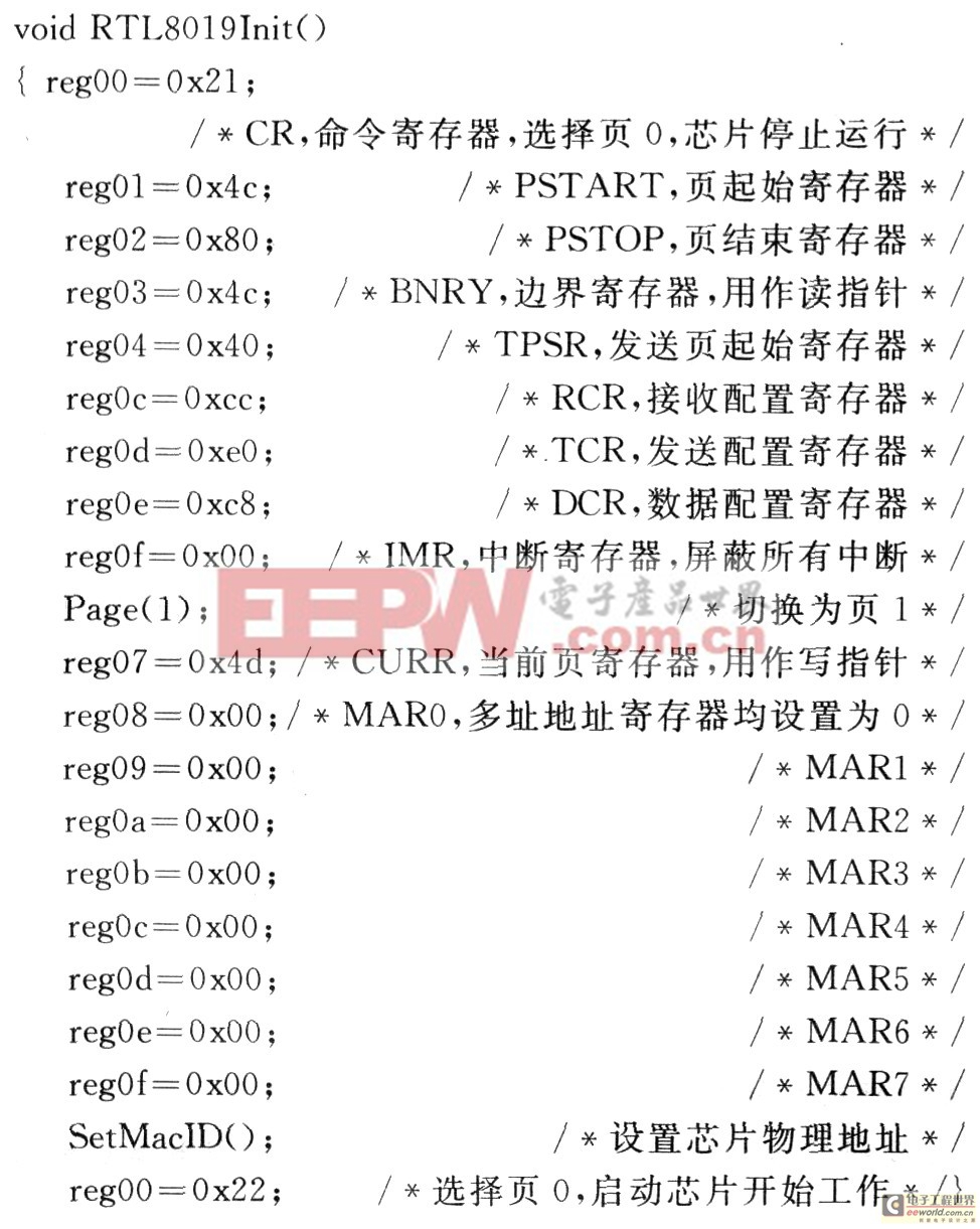 在链路层上,首先要解决RTL8019AS的驱动问题,驱动程序包括三部分:以太网接口芯片初始化程序、发送数据程序和接收数据程序,它们屏蔽了底层硬件处理细节,同时向上层软件提供与硬件无关的接口。驱动程序将已封装好的待发送数据按指定格式写入芯片并启动发送命令,8019会自动把数据包转换成物理帧格式在信道上传输;反之,8019收到物理信号后将其还原成数据,按指定格式存放在芯片RAM中以便主机程序取用,下面给出部分初始化程序,主要是对一些寄存器进行设置,其中,reg00~regof为宏定义,代表RTL8019AS内地址偏移量为00H~0FH的寄存器地址。