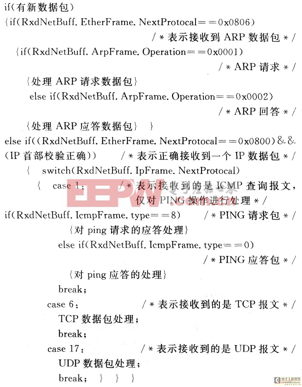单片机负责RTL8019AS的初始化及通过控制RTL8019AS实现网络协议,进行数据的接收和发送等通信任务,主程序按照以太网数据帧分用的思路进行编写,即将单片机作为服务器端,初始化完成后使其处于监听状态。当有数据从RJ45过来时,RTL8019AS在接收和处理完以太网数据帧后传送给单片机,单片机对数据包进行分析,如果是ARP数据包,则程序转入ARP处理程序;如果是IP数据包且IP地址正确,则继续分析若是ICMP包,则调用ICMP处理程序,若是UDP或TCP数据包,则解包后将数据存储或从串口输出。反之,当有数据要发送时,单片机按照各层协议格式将数据打包,送入RTL8019AS的缓存区,由RTL8019AS将数据输出到局域网中,主程序的框架如下: