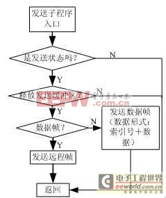 如果要向CAN控制器发送数据,则必须将符合PeiCAN帧格式的一组数据写入SJA1000的发送缓冲区,然后调用发送子程序,我们采用查询方式实现发送,如图3流程所示。