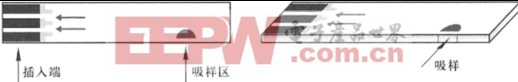 新的一组拟合曲线的参数,该参数会被事先烧写在代码校正条上,校正代码条如图3。其中特征代码实际就是拟合曲线的参数的整合成一个特殊的代码形式。图4是试剂条,由专业生物医学机构调配,因为每批试剂条的调配不可能一致,因此每次的拟合曲线参数也不一样,该参数由该机构提供,并烧写相应的校正代码条随试剂交付终端用户使用。用户每次购买一批新试剂的时候必须先通过代码校正条修改血糖仪的参数。代码校正条的设计采用和试剂条同样的接口,因此只需要像使用试剂条一样直接插入血糖仪的检测端口,就可以方便地将新参数输入到血糖仪。
