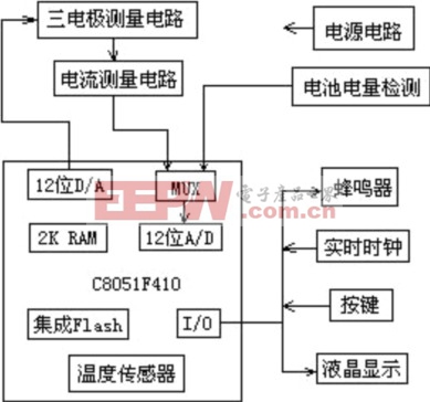 本方案采用了C8051F410单片机,充分利用其丰富的内置硬件资源,大大简化了血糖仪的电路结构,使仪器的稳定性,可靠性进一步提高,而成本却降低。高精度的A/D和D/A使得测量结果更加稳定可靠,重复性好。另外充分利用该单片机的休眠模式并且巧妙电源管理电路设计,使得该仪器可以两节普通的AAA电池就可以正常工作较长时间,使该仪器的使用更加方便。