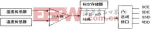 对于SHT11传感器我们将其分成5部分,首先是温度传感器可以用DS75LX型号的传感器来进行温度采集,湿度传感器可以用HS1100湿度传感器来进行湿度采集采集后的温湿度经过露点值计算功能输出湿度温度值输出分辨率为12位可编程为8位、湿度值输出分辨率为14位可编程为12位。采集后的信号后经由放大器进行放大再进行14位的A/D转换,可以将转换后的温湿度数据存储在标定存储器里面,或在需要的时候送到二线I2C总线器件从而将数字信号抓换为符合I2C总线协议的串行数字信号。I2C的四个管脚分别是SCK(串行时钟输入)、GND(接地端)、DATA(双向串行数据线)、VDD(电源端专门接0.4~5.5V的电源)传感器结构框图如图2所示。