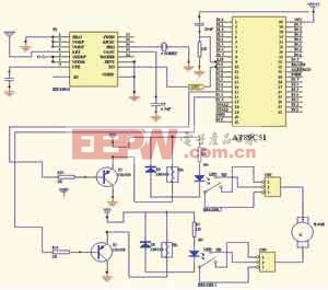 无线信号经MICRF002接收后经过调制重新变成串行数据,经由DO口送出到单片机AT80C51的P3.0口,利用程序对P3.0口输入的串行数据进行分析,如果温度和适度都适合则将P3.5口置1并且P3.6口置0,如果温度和湿度不适合,则将P3.5口置0并且P3.6口置1。除了温度和湿度的分析,可以设置单片机的内部时钟来控制P3口的置0或1。当P3.5口置1,P3.6口置0时,由P3.5口接出来的电磁继电器为吸合状态,相反P3.6口接出来的继电器为未吸合状态,这样就可以控制电动机正转。如果情况相反则电动机为反转状态。如果P3.5或P3.6口为0或1的时间达到规定的时长,则设置P3.5和P3.6口均为0。这样防止电动机无限制转动。原理图如图4所示。