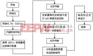 软件采用了KeilC51汇编和C混合编程语言,主程序包括:系统初始化、定时器T0的时间设定,接收传感器SHT11传出的数据信息程序、运算处理温湿度数据信息程序、发送程序、接收程序、中断调用程序。为了使系统正常运行加强系统的可靠性,在系统的设计上可以采取指令冗余、软件陷阱、容错设计、系统中断设计和外部强行中断设计,以防在实际的运行中外界的干扰产生误差和人为重新调整带来的误差,从而保证测量的准确性可靠性。系统软件流程如图6所示。