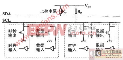 AR M 12C 总线由一根数据线SDA( se riald ataline)和一根时钟线SCL(serial clock line)构成,每个电路模块挂在12C总线的SDA和SCL线上和主芯片进行数据交换。12C总线上的接口电路的输人端必须是开漏或集电极开路以具有“与”的功能。在标准模式下,数据传输速度为1 000 kbps,在高速模式下为4000 kbpsoARM 12C总线的接口电路如图1所示。