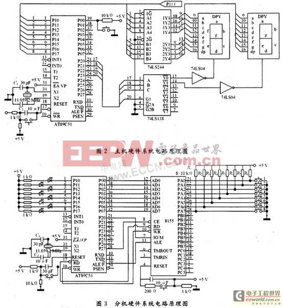 在AT89C51的发送端TXD、接收端RXD,采用RS 232C电平传输,采用2片电平转换芯片MAX232,由于单片机为TTL电平,一片MAX232实现TTL-RS 232C电平的转换,另一片实现RS 232C-TTL电平的转换。
