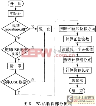 PC机的软件部分主要用于实现上位机同下位机之间的USB通信,光栅位移传感器位移信号的细分和显示等功能。实现这一功能的方法有很多种,比如采用简单的VB、数据处理能力很强的Delphi,或国内外广泛采用的Borland C和VC等。为了下一步的软件开发以及与厂家的其他软件接口,本系统上位机的软件部分采用VC++6.0来实现。图3是PC机软件部分的流程图。