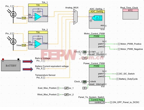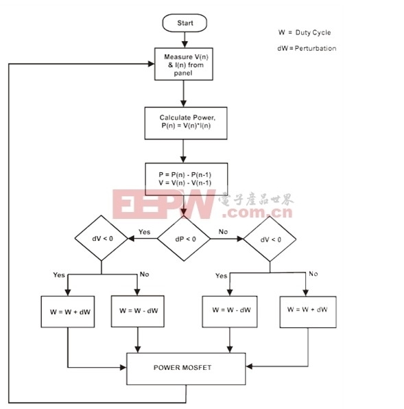 3。太阳能电池的V-I特点 图4说明了太阳能电池功率和电压的对比图。可以看出,对于短路电流(Isc,功率图最左面点),和开路电压 (Voc,功率图最右面点),面板输出功率都为零。在某一个点,称为最大功率点,输送到面板的功率是最大的。MPPT算法的目标是使太阳能面板工作在这一点上,输出最大功率。 图4 功率与电压对比图 面板输出连接到DC-DC转换器单元,其将面板电压转换成一个适合电池充电的可用电压。DC-DC单元包括由MOSFET、电感、滤波器。操作DC-DC转换器必要的开关脉冲(PWM)由MCU产生。紧接着DC-DC单元的是一个MOSFET开关,用于通过面板改变负载。正如之前的解释,对于给定的温度和日照,面板输出功率随连接的负载变化而变化,对于某个特定负载,功率传输最大。可变负载也可称为可变操作点。我们的目标是跟踪这个变化的最大功率点。 用于来跟踪最大功率点机制的流程图如图5所示: 图5 MPPT算法的流程图 这个MPPT设计方法是基于PV阵列输出电压或电流规则的,或者基于相应的参考电压或电流信号,要么是常数或来自PV光伏阵列输出特性(例如,功率和功率变化)。该方法的一个变化是直接使用dc/dc转换器占空比作为控制参数,强制导数dP / dD为零,这里P是PV阵列输出功率,D是占空比。因此只需要一个控制环路。 最常用的扰动观察法是最MPPT算法。在该方法中,连接MOSFET(隔开面板和电池)的PWM的占空比变化量很少,只有几dW。如果这少量变化增加了。面板电压和电流会测量到,相应的功率变化dP也会观察到。如果变化是正的,那么扰动是正确的方向,我们继续在相同的方向扰动(例如,增加占空比)。如果功率改变是负的,那么就要翻转颠倒扰乱方向(例如,减少占空比责任周期)然后继续工作。这种算法的主要目的是总是提升功率曲线,以达到从太阳能电池输出最大功率。通过这种方式,我们可以使太阳能电池板总是工作在提供最大功率的点上。 如果还没有实现MPPT系统,连接到面板的负载总是一成不变的,它不可能工作在最大功率点。因此,它将不再从面板捕获最大功率。 电池健康管理: 因为太阳能板暴露在太阳下的时间大约为半天,这个期间它可以用来给电池充电。对于大多数市面上能买得到的铅酸电池,充电需要10 - 12小时,这和有阳光的时间大约是相同的。然而,为了提高电池的使用寿命,可以采用下面的方法。通常,电池充电要经历三个阶段,如图7所示:: · 恒流充电或大量充电阶段 · 顶部充电阶段 · 浮充电阶段 让我们以一个12V铅酸电池充电为例。电池电平通过MCU内置的ADC模块连续监测。如果电池电压小于标称值,那么称为“接受电压Accept Voltage”的适当充电电压应用于电池,随温度而变化,。应用于电池的接受电压电压使用PWM驱动的大功率晶体管切换,从DC-DC电源转换器输出。在这期间,充电电流不变。在铅酸电池情况下,我们可以称之为大量充电阶段。一旦电池电压达到标称值,电池就已经充了70%。现在还要继续充电,直到电流降到大约电池额定电流的3%。这可通过前面介绍的持续PWM充电方式实现。这个充电阶段称为顶部充电阶段。当充电电流降到额定电流的3%,电池完全充满。顶部充电阶段用来保持电池健康。如果没有顶部充电阶段,电池会逐渐失去完全充电的能力。 充电完成后,为了维持充电电平,电池采用PWM波形形式的合适电压(称为浮充电压)。浮充电压通常用于自放电补偿(通过铅和其他寄生效应)。电池的浮充电压和接受电压随温度变化而变化。MCU连续读取温度传感器的输出,然后确定接受电压和浮充电压。他们的值由MCU产生的PWM波形控制。 还要确保电池不要长时间进行顶部充电。电池必须要有相反地浮充电,因为电池可能无法容忍过渡充电。在片内RTC的帮助下,这很容易实施。脉冲充电电池充电的优势是,我们避免了很多化学效应,例如硫酸盐化作用,有毒气体等等。还要以避免电池在50摄氏度以上充电。温度传感器就是用于此用途。 图6电池充电 可以使用一颗片上系统(SoC)实现我们谈到的整个系统,比如赛普拉斯的混合信号芯片PSoC,其具备可编程模拟和可编程数字逻辑。所需的外部组件仅仅是一个二极管和DC-DC转换器的电感,以及用来平衡电池和PV模块电压的电阻。 图7:PSoC实现示意图 PSoC包含的跨阻放大器(TIA)组件可以提供基于放大器的和对数电流-电压转换增益,并具有阻抗增益,用户可以选择带宽。放大器的增益可以使用反馈电阻器设置,可以通过固件选择20?K、30?K、40 ?K,80?K,150?K, 250?K,500?K和1 M?。光电二极体通常输出体现为电容,并
