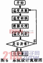 系统的工作流程是:LM35采集温度,并且将温度信号转换成电信号:A/D转换将线性放大后的模拟电信号进行A/D转换,使之成为单片机能够处理的数字信号;单片机通过处理转换后的数字信号来分析采样的温度值,并将分析结果送到报警输出电路中;报警输出电路根据分析的结果做出相应的反应。系统的软件设计流程图如图6所示。